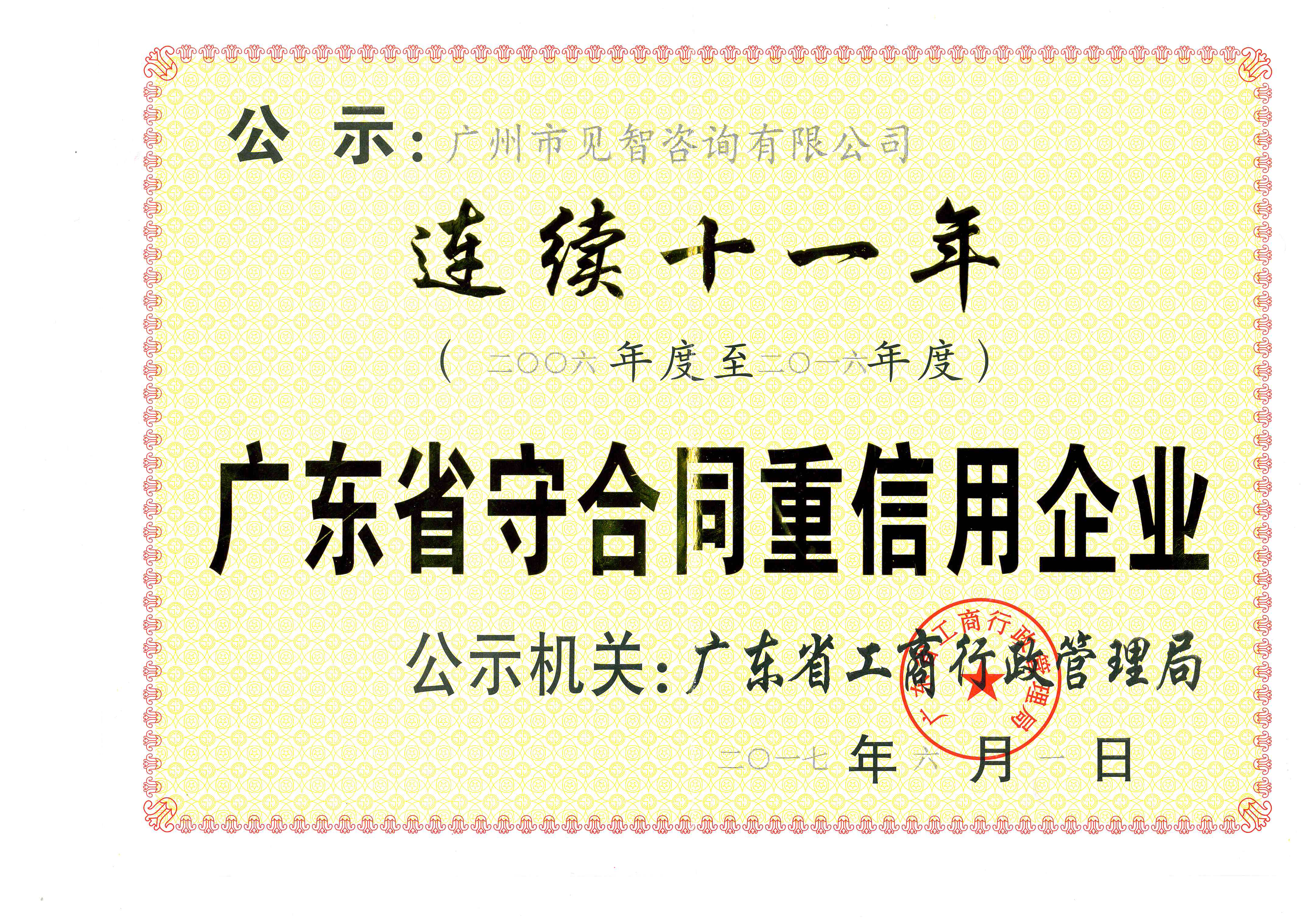 ?熱烈祝賀廣州市見智咨詢有限公司(以下簡稱“公司”)獲得由廣東省工商行政管理局頒發(fā)的“連續(xù)十一年重合同守信用”榮譽,這一榮譽是社會、政府、市場客戶等多方對公司長期誠信經(jīng)營的充分肯定。