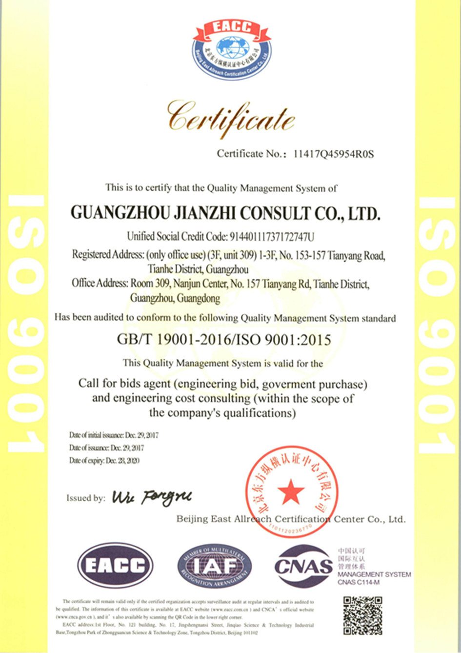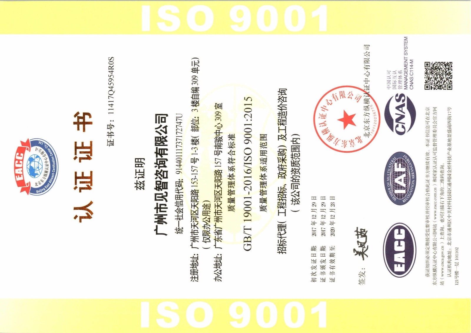 近日,廣州市見智咨詢有限公司順利通過質(zhì)量管理體系認(rèn)證審查,針對我司所從事的招標(biāo)代理(工程招標(biāo)、政府采購)及工程造價咨詢進(jìn)行了審核,在公司全體員工的共同努力下,我司以完善的管理體系和嚴(yán)謹(jǐn)?shù)姆?wù)措施順利通過了GB/T 19001-2016 /ISO 9001:2015質(zhì)量管理體系認(rèn)證,并榮獲EACC(北京東方縱橫認(rèn)證中心有限公司)頒發(fā)的證書。